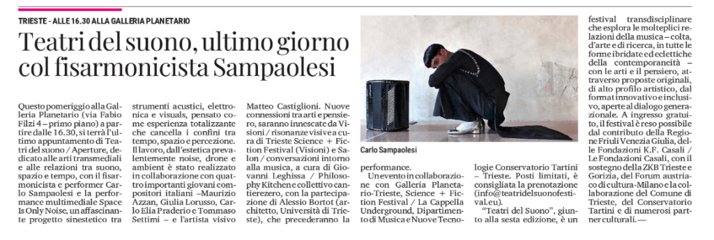 Ultimo appuntamento per Teatri del Suono con il fisarmonicista Sampaolesi da Fondazioni Casali | Ott 26, 2025 | News | 0 commenti Le Fondazioni Casali sostengono il festival interdisciplinare giunto alla sesta edizione