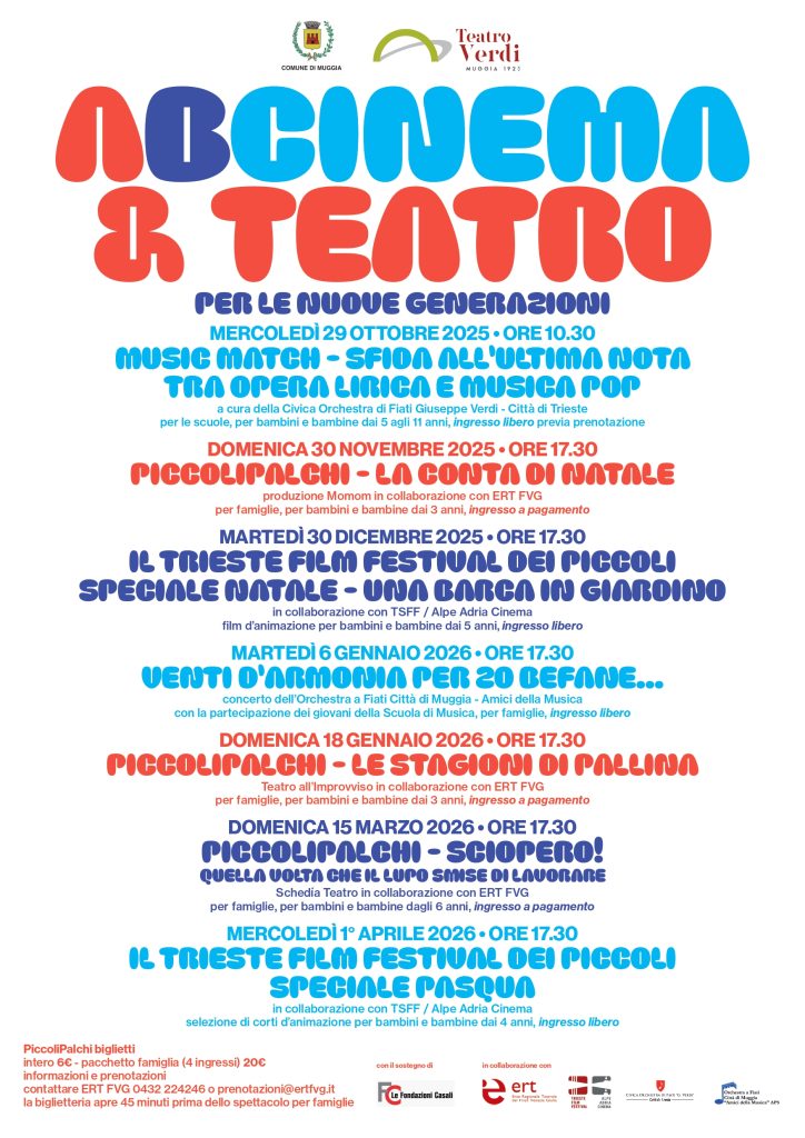 A Muggia al via la rassegna ABCINEMA & TEATRO, progetto Art Bonus sostenuto dalle Fondazioni Casali da Fondazioni Casali | Ott 28, 2025 | News | 0 commenti Dal 29 ottobre 2025 al 1 aprile 2026 tanti spettacoli dedicati ai più piccoli