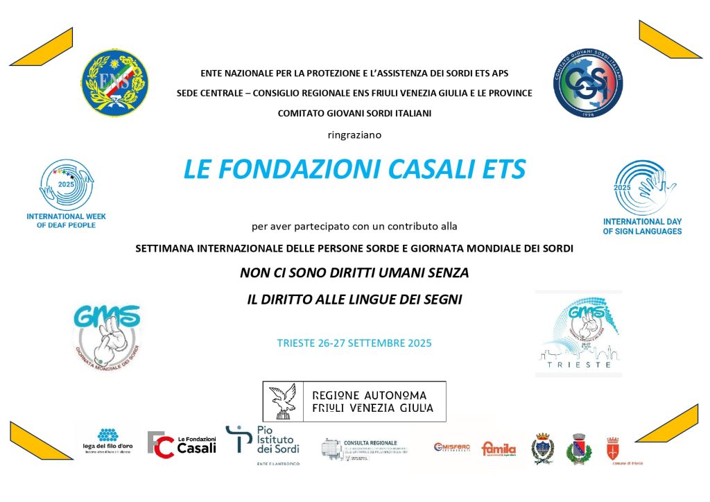 È stato un piacere per noi contribuire alla loro realizzazione e condividiamo con gioia l’attestato di ringraziamento ricevuto da parte del Consiglio Regionale dell’Ente Nazionale Sordi. Qui le info sull’evento: https://www.ens.it/gms-2025/