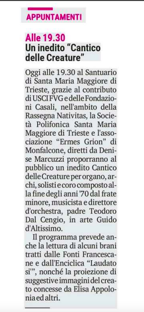 Oggi alle 19.30 al Santuario di Santa Maria Maggiore un inedito “Cantico delle Creature”